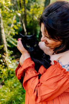 We began our session at the car where her beloved cat waited patiently. Yes, she brought her cat. And yes, it was perfect. She scooped him up for a few quick shots, and he nuzzled into her like he knew exactly how important this moment was. Then, as we walked along the path, the sun broke through the trees in soft beams that danced across her shoulders. She laughed. She twirled. She stood still and let the quiet wrap around her.