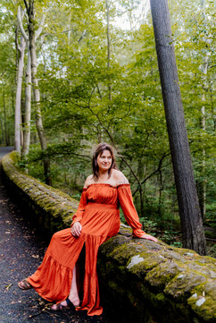 We chose Nolde Forest in Reading, PA for the setting. The path through the woods leading to the mansion felt like it was made for her—peaceful, a little magical, and rooted in history. She wore a long, flowy dress that moved with the breeze and crowned herself (literally) with a radiant starburst headpiece. The whole look was ethereal. She looked like the forest goddess she was always meant to be.
